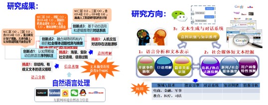 围绕人机交互中的自然语言理解技术,处理对象逐渐从传统的正规文本过渡到口语化、碎片化的社会媒体文本中。以1)语言分析和表示学习为基础,2)社会媒体短文本话题挖掘,3)时序多文档与社会媒体摘要及4)文本生成与智能对话系统四方面互相促进。1)-4)分别侧重自然语言的语义理解、内容获取、组织和生成。可用于电商、金融、教育、医疗、司法及军事等领域的知识图谱构建、搜索引擎、问答系统、舆情监控、竞争情报分析及人机交互的智能客服等。