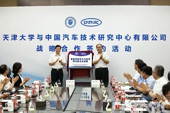 签约仪式上,副校长元英进与中汽中心党委副书记高和生签署战略合作协议,智能学部主任李克秋与中汽中心数据中心主任郑继虎签署联合实验室共建协议,李家俊和于凯一同为“智能网联技术与应用研究联合实验室”揭牌。
