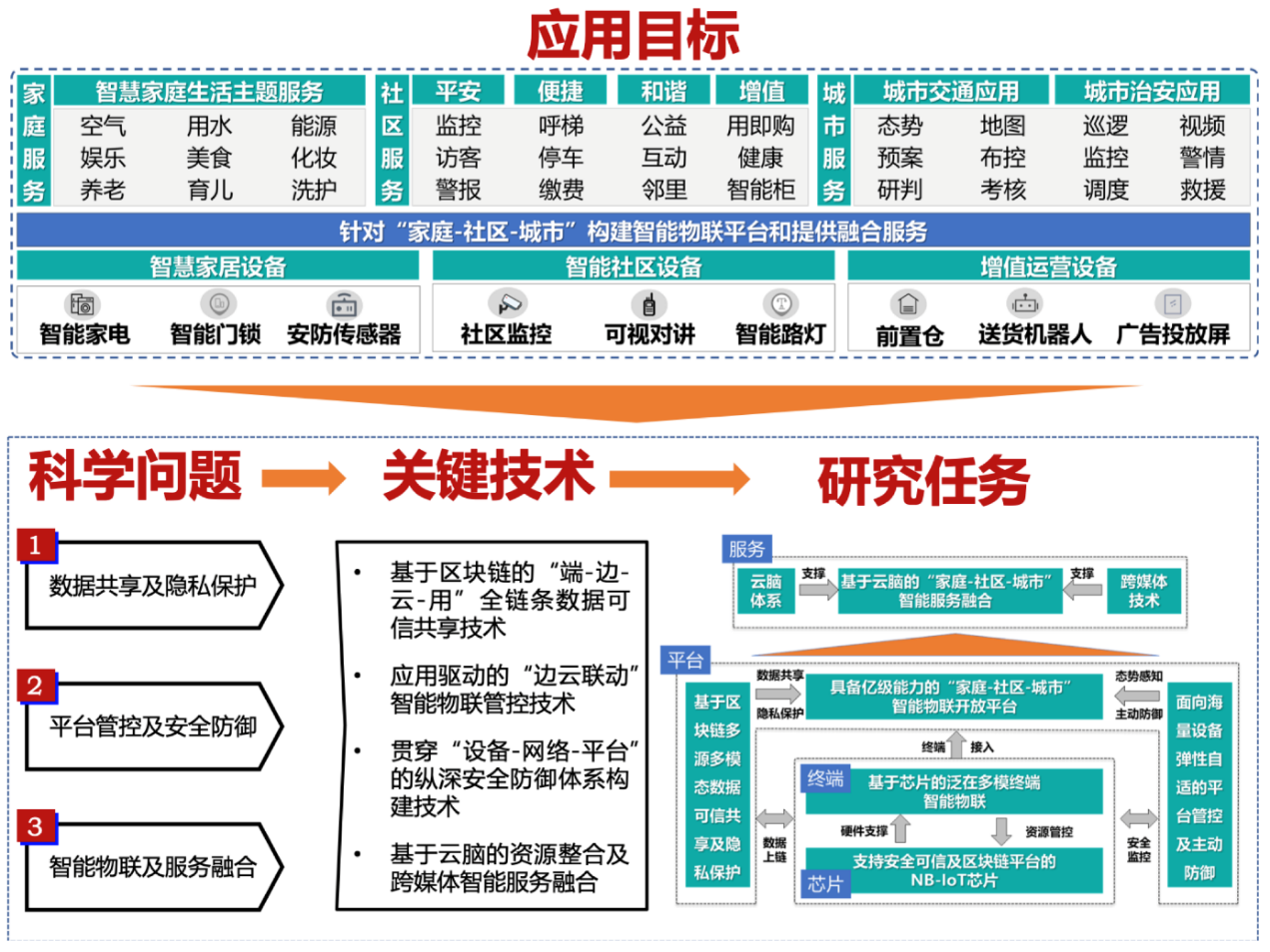 该国家重点研发计划项目针对智慧生活领域在硬件设备、操作系统、管控体系、安全机制、物联平台、服务方案等方面的建设,提炼出数据共享及隐私保护、平台管控及安全防御、智能物联及服务融合三个拟解决的科学问题。重点突破基于区块链的“端-边-云-用”全链条数据可信共享,应用驱动的“边云联动”智能物联管控,贯穿“芯片-设备-网络-平台”的纵深安全防御,基于云脑的资源整合及跨媒体智能服务融合四项关键技术。最终构建面向“家庭-社区-城市”的通用智能物联平台,并打造融合服务应用示范。有望形成覆盖智慧生活产业链上下游,集技术、产品、系统为一体的整体解决方案及应用示范,促进人工智能产业链在智慧生活领域的纵向整合,打造“硬件+软件+应用+服务”一体化生态圈,引领行业健康快速发展,为践行“数字中国”战略的创新发展提供成功范例。