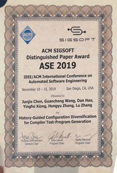 (通讯员 赵英全)软件工程领域顶级会议34th IEEE/ACM International Conference on Automated Software Engineering(ASE 2019)于2019年11月11日至15日在美国加州圣地亚哥举办。我学部陈俊洁副教授与北京大学和纽卡斯尔大学合作的论文《History-Guided Configuration Diversification for Compiler Test-Program Generation》荣获ASE 2019的最佳论文奖(ACM SIGSOFT Distinguished Paper Award)。