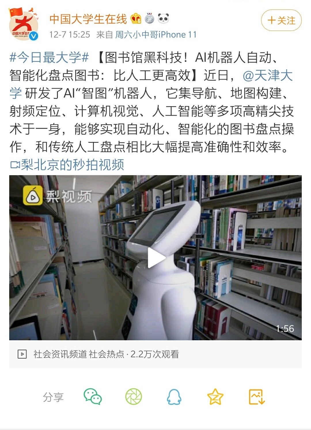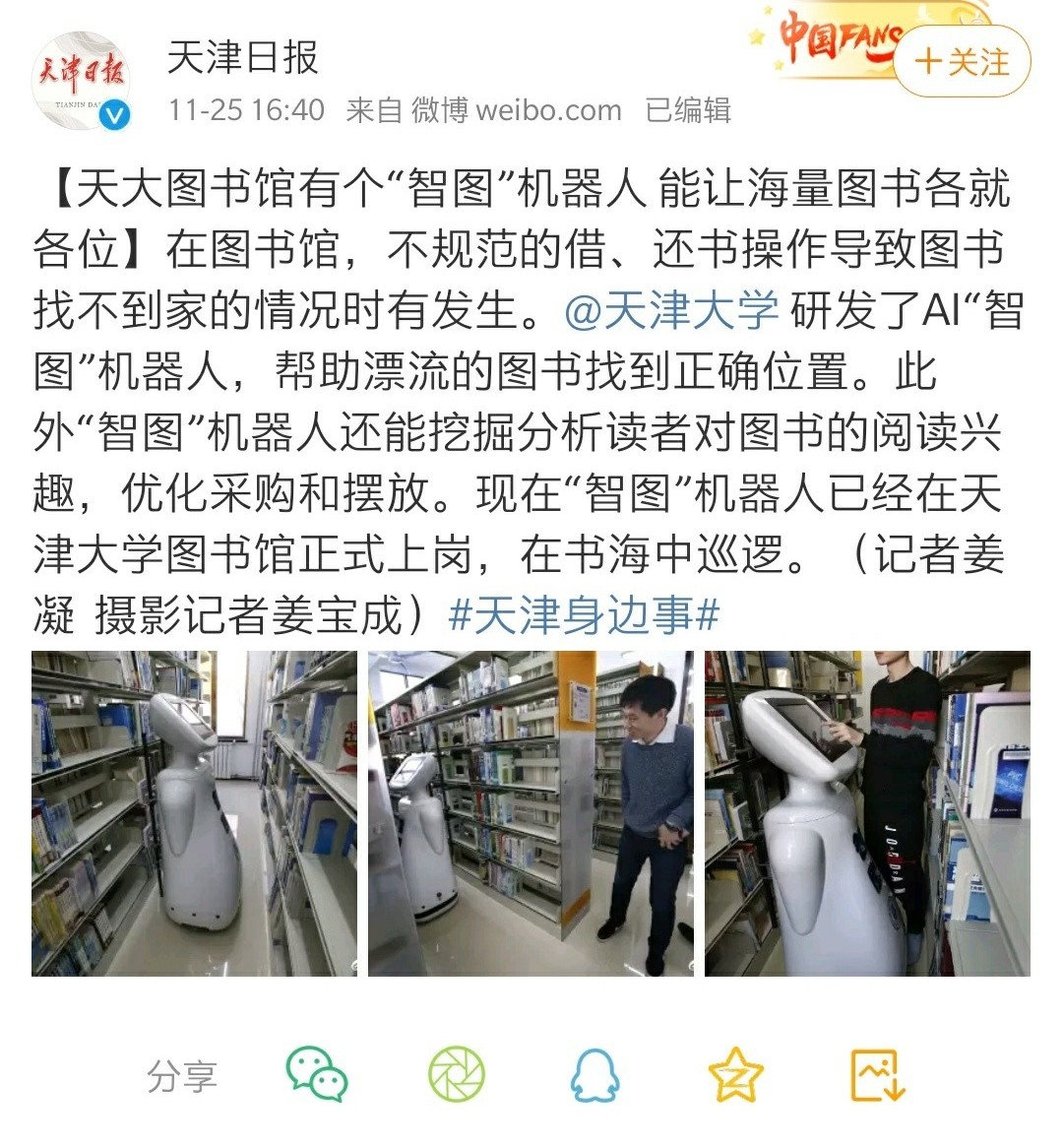 成人影视片 研发了AI“智图”机器人,帮助漂流的图书找到正确位置。此外“智图”机器人还能挖掘分析读者对图书的阅读兴趣,优化采购和摆放。