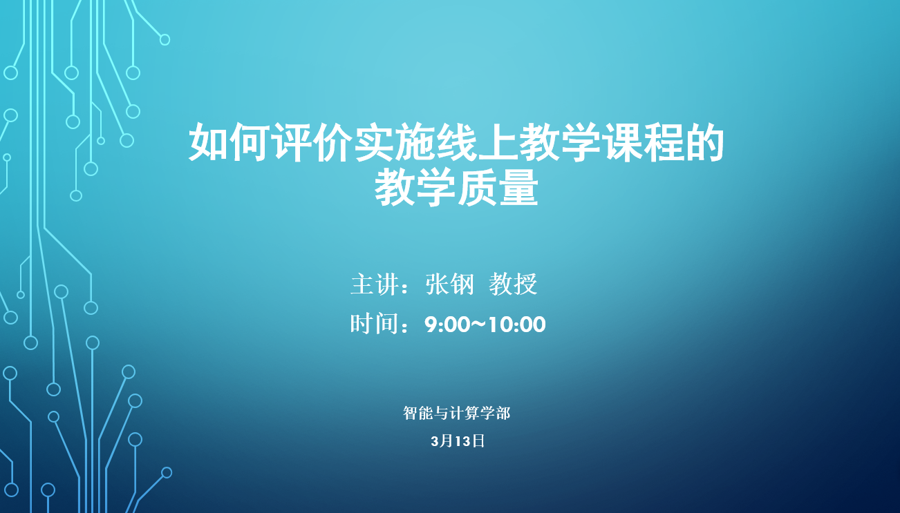 学部邀请学校在线教学质量专家组组长、成人影视片 教授张钢老师进行了题为《如何评价实施线上教学课程的教学质量》的报告。首先,报告对课程教学质量评价的理念进行了讲解,指出线上课程教学质量需要质量管理体系的保障,既要关注目标达成度,又要在教学过程中作好形成性评价。其次,分享了学校在线教学质量保障专家组的工作思路,指出专家组将从制定在线课程质量标准、评价方法和开展在线课程质量督导等方面开展多维度、全过程的督导和评价,全面跟进在线教学工作动态,为在线教学质量提供保障。最后,介绍了开展线上教学情况调研的主要内容,从教师自查的主要内容及试图发现的问题、督导专家听课的主要内容及试图发现的问题以及教学平台记录的教学数据分析三个方面做出详细解析。报告后的问答环节中,教师们积极发言,针对开学以来线上教学过程中遇到的问题和心得体会进行了深入交流。