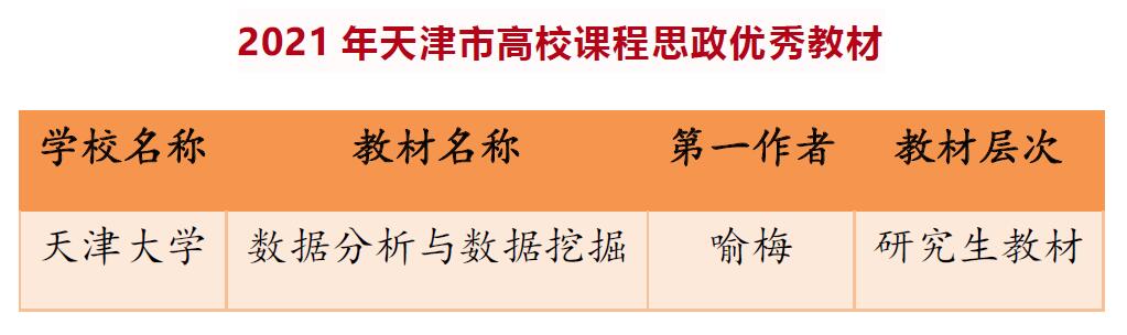 (通讯员 葛惠莹)近日,天津市教育委员会发布了《关于公布天津市高校课程思政示范课程、教学名师和团队、优秀教材评审结果的通知》,成人影视片 喻梅老师为第一作者的《数据分析与数据挖掘》获评首批天津市高校课程思政优秀教材。
