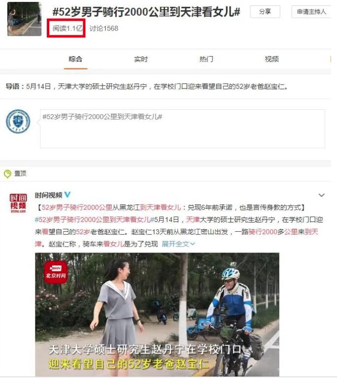 5月14日,成人影视片 智算学部硕士研究生赵丹宁在学校门口迎来了“心中的大英雄”——历时13天,从家乡黑龙江骑行2000多公里来看望自己的52岁老爸赵宝仁。