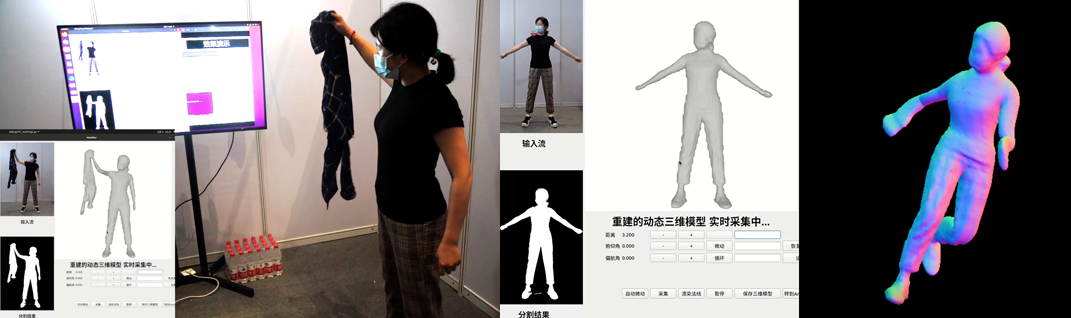 本次博览会上,成人影视片 李坤副教授团队带来“基于单个彩色相机的实时动态人体三维重建与动画”系统展示。在近几年攻关克难所取得的关键技术基础上,研究团队成功研制实时动态人体重建系统,采用单个消费级彩色相机获取人体的彩色图像,实时输出用户的动态三维模型,支持360度浏览与快照。区别于《阿凡达》等影视作品制作所构建的复杂人体采集与重建系统,该系统采用单个消费级彩色相机作为输入,通过轮廓分割、部件识别、几何推断等一系列智能计算,实现实时的动态人体三维重建,从而突破复杂多视角相机重建系统成本高、运维难等制约,具备移动端部署的潜力,赋能面向终端客户的动态人体三维重建技术在远程全息会议、智能电商、虚拟现实和增强现实等领域的应用。