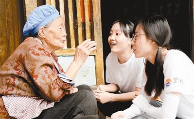 实践队成员与当地群众交流。