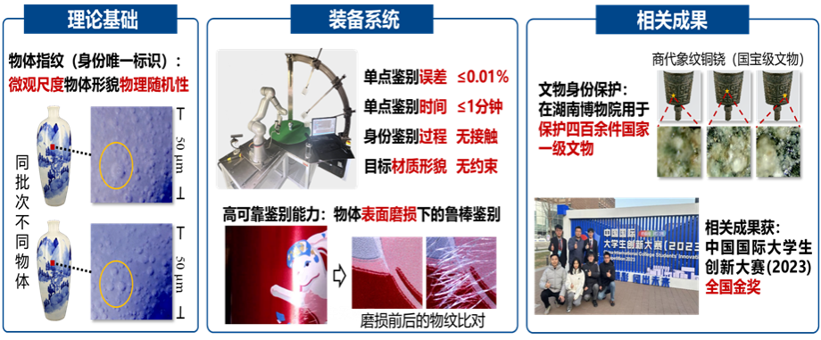 基于物体微观具有物理随机性和唯一性的特点,研发了首个面向目标自主感知与精确分析的数字物纹系统,可有效实现无损、无接触要求下的高值目标状态精细监测与身份鉴别。该成果获国家重点研发计划项目支持,目前已在文物保护领域得到重要应用,成功让湖南博物院400余件珍贵文物拥有了“数字物纹”,极大提升了我国馆藏文物身份安全保护与管理的水平。