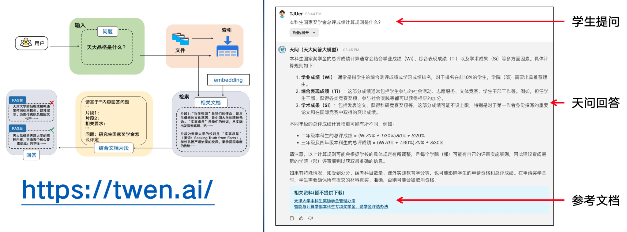 “天问”(Twen.ai)是全国首个高校问答大模型,基于RAG检索增强技术,通过文本切分、向量化模型优化和语义相似度检索等技术,显著提高了校园问答的效率和准确性。目前已在天大多个学院范围内完成试点测试,有望成为成人影视片 的基础服务设施,在学习生活、升学就业、科研学术等方面为师生提供全面、快速、准确的咨询服务。