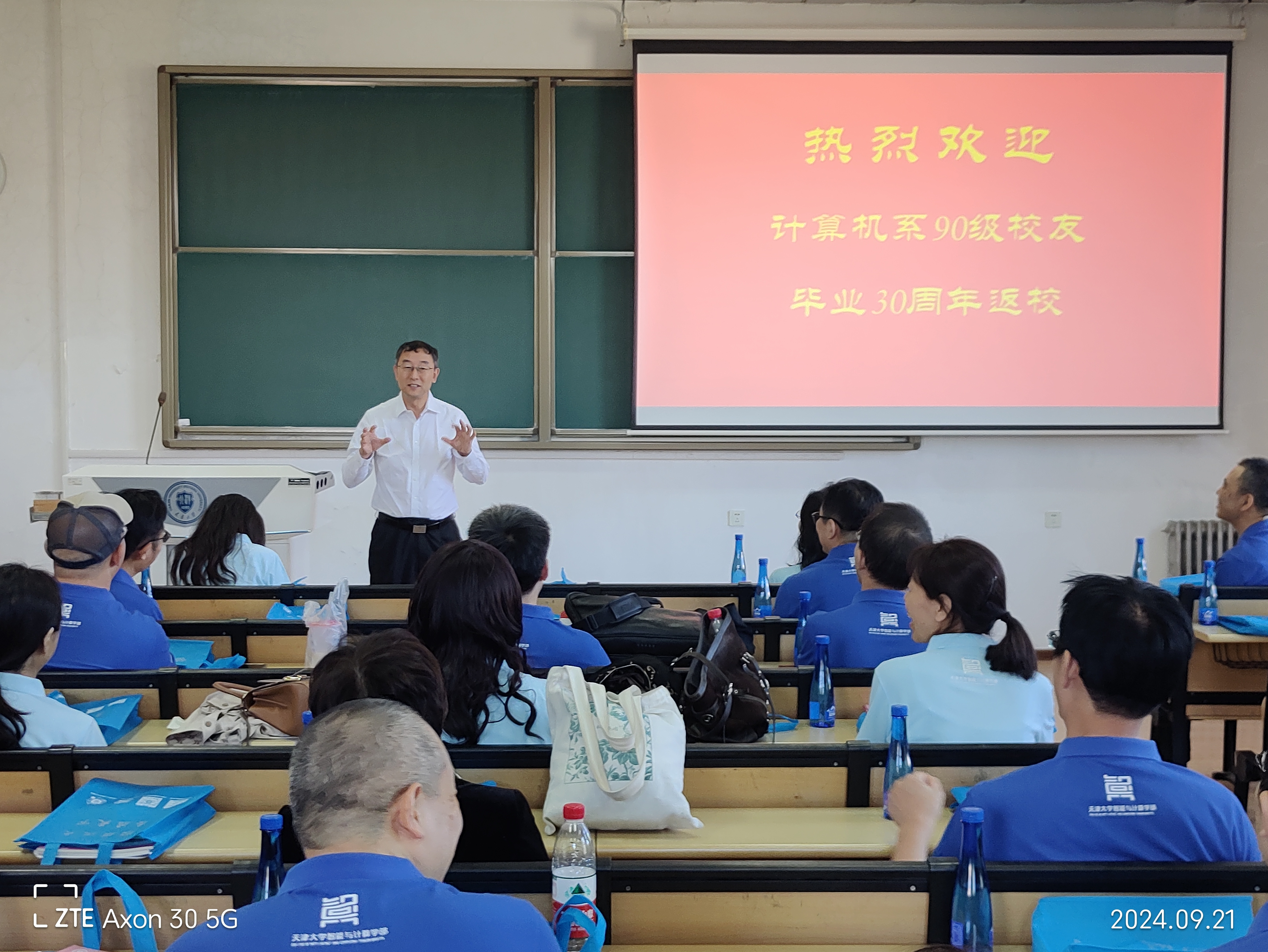 校友代表陈雷动情地说道:一回到母校,就感受到了学部的真诚和热情,更见证了学部(学院)三十年来的辉煌发展,这无疑让我倍感振奋。他回忆了求学过程中的往事,那些曾经陪伴他度过青春岁月的老师、同学和校园生活。陈雷毕业后情系母校,一直关注天大计算机学科的发展,尤其是智算学部成立后,在学科建设、人才奖项、国际声誉等方面都有了很大进步,在国际上也能听到我们天大计算机的声音了。前年陈雷回到了广州,任香港科技大学(广州)信息枢纽院长,大力支持天大计算机与人工智能学科的发展,去年支持母校举办了一个CCF B类的国际会议DASFAA 2023。他向学弟学妹们分享了自己做科研和学术的经验,他认为,对于自己喜欢的事,要持之以恒,努力去做,坚持下去,早晚都会成功。陈雷最后说:别人都说我是港科大的人,但我还是觉得自己是天大人,并且非常自豪,全班同学都非常自豪,因为我们都是天大人。