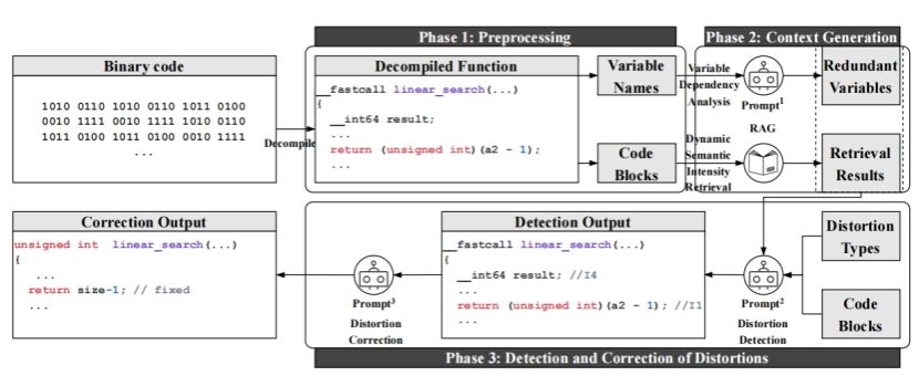 该成果旨在解决二进制反编译过程中普遍存在的失真问题。反编译技术在逆向工程和软件安全分析中具有重要作用,能够将二进制文件还原为人类可读的代码。然而,现有反编译方法往往会引入变量名混乱、冗余代码、控制流结构错误等多种失真,严重影响反编译代码的可读性和准确性,尤其在闭源环境下,这一问题更加突出。为此,研究团队提出了FidelityGPT框架,通过系统化的失真检测与修复策略,显著提升反编译代码的质量。具体而言,FidelityGPT首先定义了六类典型反编译失真,并构建了相应的反编译失真数据库,用于精确识别和分类各种失真。随后,框架结合检索增强生成(RAG)技术与语义感知算法,从数据库中动态选取高相关代码示例进行修复,同时利用变量依赖分析解决长函数和冗余变量问题,克服大模型在处理长代码段时的输入限制。实验结果表明,在620对反编译函数上,FidelityGPT的失真检测准确率达89%,失真修复率(Fix Rate)达94%,显著优于现有最先进技术。该成果不仅提升了反编译代码的可读性与可靠性,也为闭源环境下的逆向工程与软件安全分析提供了更为有效的工具和方法。