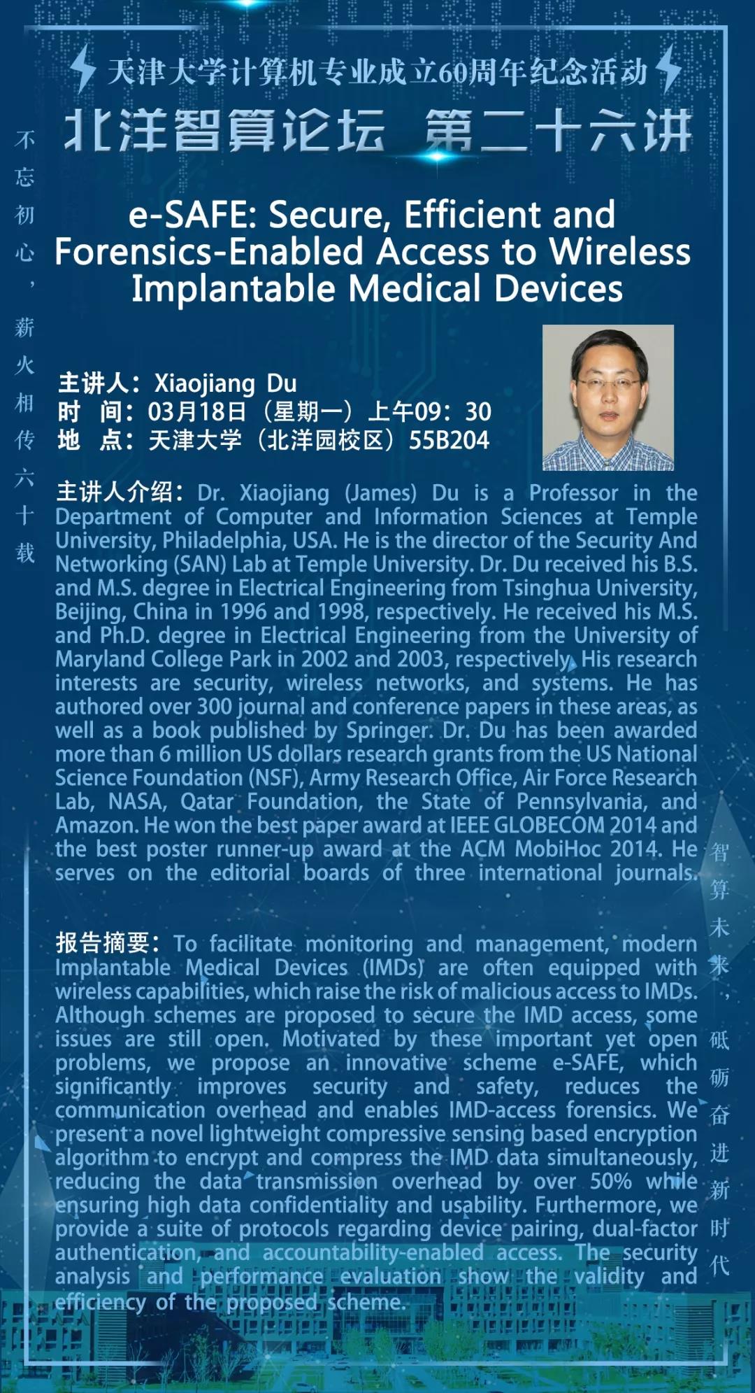 Dr. Xiaojiang (James) Du is a Professor in the Department of Computer and Information Sciences at Temple University, Philadelphia, USA. He is the director of the Security And Networking (SAN) Lab at Temple University. Dr. Du received his B.S. and M.S. degree in Electrical Engineering from Tsinghua University, Beijing, China in 1996 and 1998, respectively. He received his M.S. and Ph.D. degree in Electrical Engineering from the University of Maryland College Park in 2002 and 2003, respectively. His research interests are security, wireless networks, and systems. He has authored over 300 journal and conference papers in these areas, as well as a book published by Springer. Dr. Du has been awarded more than 6 million US dollars research grants from the US National Science Foundation (NSF), Army Research Office, Air Force Research Lab, NASA, Qatar Foundation, the State of Pennsylvania, and Amazon. He won the best paper award at IEEE GLOBECOM 2014 and the best poster runner-up award at the ACM MobiHoc 2014. He serves on the editorial boards of three international journals. Dr. Du served as the lead Chair of the Communication and Information Security Symposium of the IEEE International Communication Conference (ICC) 2015, and a Co-Chair of Mobile and Wireless Networks Track of IEEE Wireless Communications and Networking Conference (WCNC) 2015. He is (was) a Technical Program Committee (TPC) member of several premier ACM/IEEE conferences such as INFOCOM (2007 - 2019), IM, NOMS, ICC, GLOBECOM, WCNC, BroadNet, and IPCCC. Dr. Du is a Senior Member of IEEE and a Life Member of ACM.