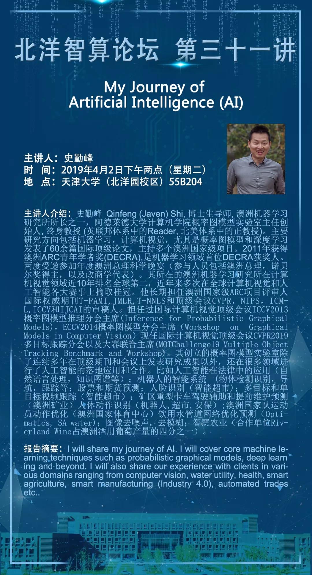 史勤峰,博士生导师, 澳洲机器学习研究所所长之一,阿德莱德大学计算机学院概率图模型实验室主任,创始人, 终身教授 (英联邦体系中的Reader, 北美体系中的正教授) 。主要研究方向包括机器学习,计算机视觉,尤其是概率图模型和深度学习。发表了60余篇国际顶级论文,主持多个澳洲国家级项目。2011年获得澳洲ARC青年学者奖(DECRA), 是机器学习领域首位DECRA获奖人。两度受邀参加年度澳洲总理科学晚宴(参与人员包括澳洲总理,诺贝尔奖得主,以及政商学代表)。其所在的澳洲机器学习研究所在计算机视觉领域近10年排名全球第二,近年来多次在全球计算机视觉和人工智能各大赛事上摘取桂冠。