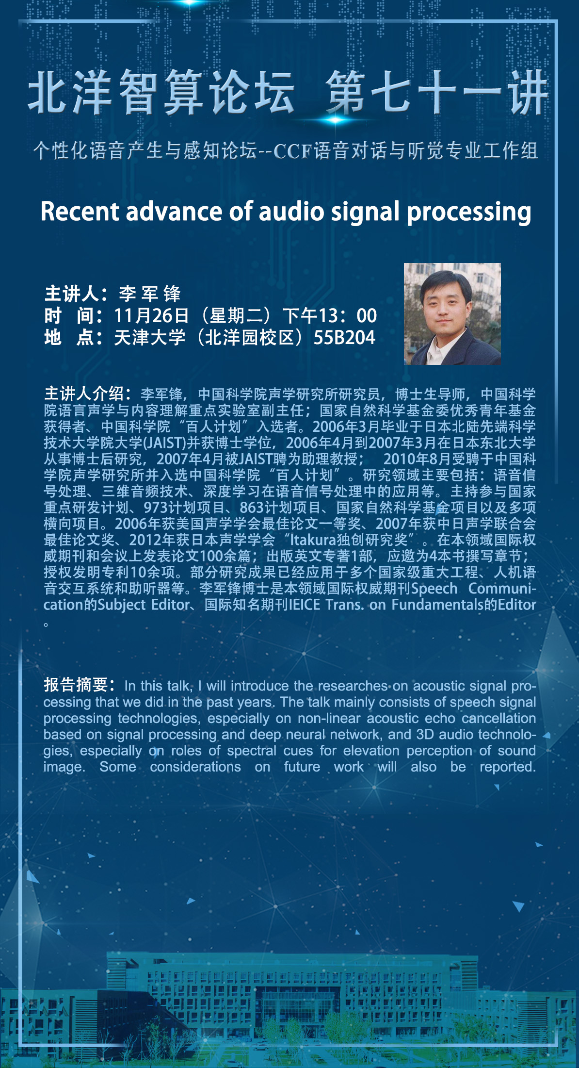 李军锋,中国科学院声学研究所研究员,博士生导师,中国科学院语言声学与内容理解重点实验室副主任;国家自然科学基金委优秀青年基金获得者、中国科学院“百人计划”入选者。研究领域主要包括:语音信号处理、三维音频技术、深度学习在语音信号处理中的应用等。主持参与国家重点研发计划、973计划项目、863计划项目、国家自然科学基金项目以及多项横向项目。在本领域国际权威期刊和会议上发表论文100余篇;出版英文专著1部,应邀为4本书撰写章节;授权发明专利10余项。部分研究成果已经应用于多个国家级重大工程、人机语音交互系统和助听器等。李军锋博士是本领域国际权威期刊Speech Communication的Subject Editor、国际知名期刊IEICE Trans. on Fundamentals的Editor。