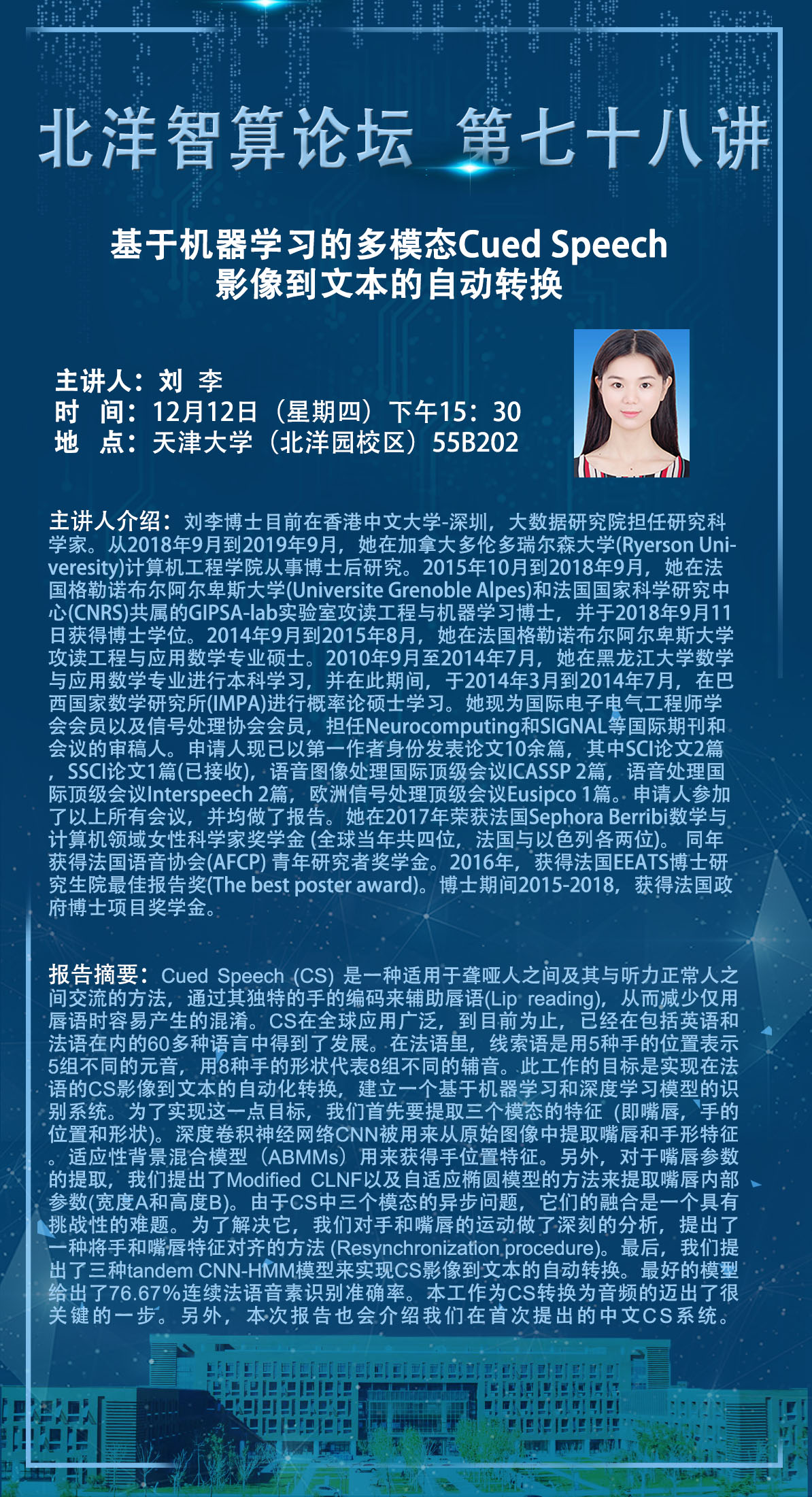 Cued Speech (CS) 是一种适用于聋哑人之间及其与听力正常人之间交流的方法,通过其独特的手的编码来辅助唇语(Lip reading),从而减少仅用唇语时容易产生的混淆。此工作的目标是实现在法语的CS影像到文本的自动化转换,建立一个基于机器学习和深度学习模型的识别系统。本工作为CS转换为音频的迈出了很关键的一步。另外,本次报告也会介绍我们在首次提出的中文CS系统。