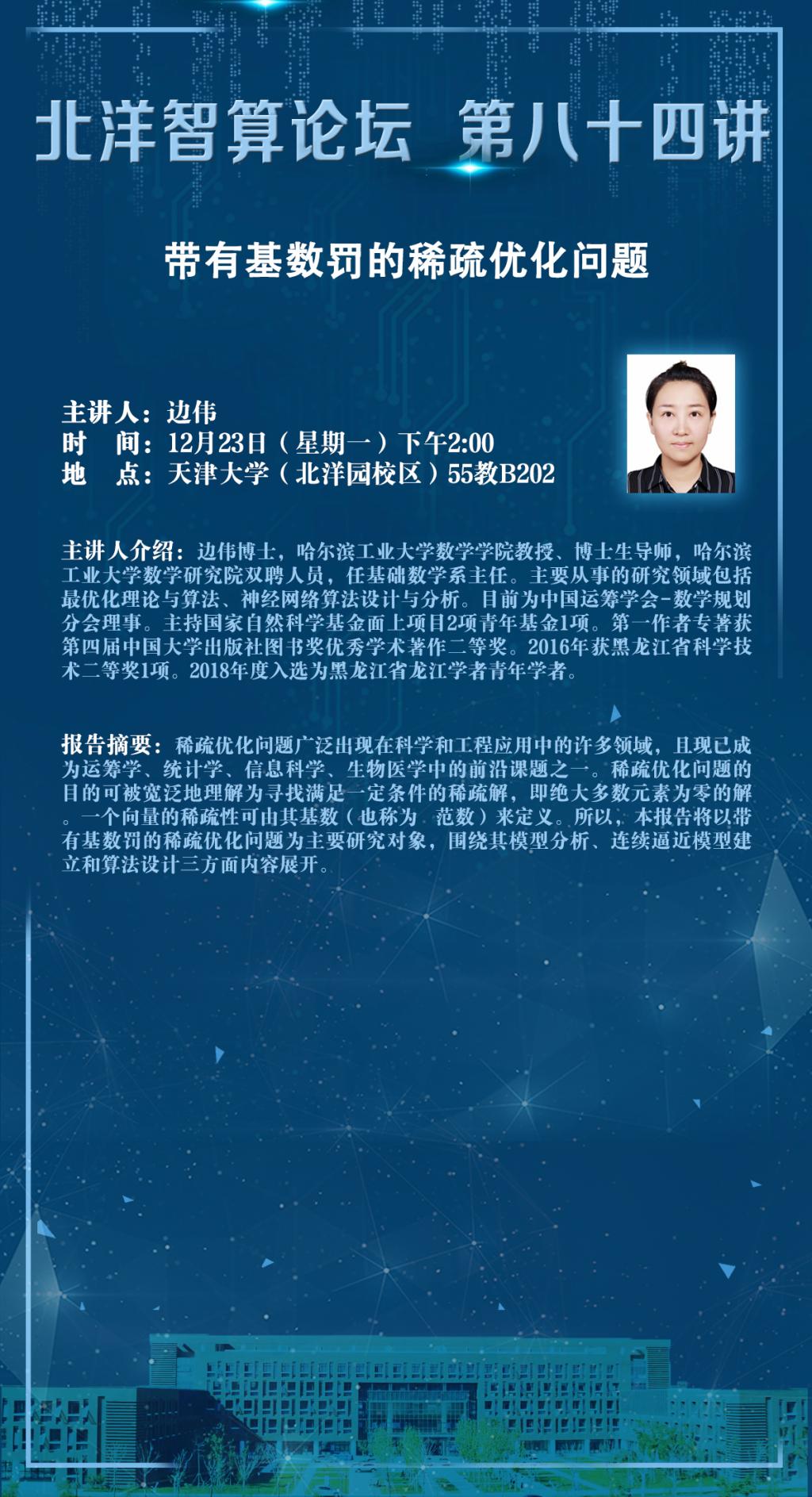 边伟博士,哈尔滨工业大学数学学院教授、博士生导师,哈尔滨工业大学数学研究院双聘人员,任基础数学系主任。主要从事的研究领域包括最优化理论与算法、神经网络算法设计与分析。目前为中国运筹学会-数学规划分会理事。主持国家自然科学基金面上项目2项青年基金1项。第一作者专著获第四届中国大学出版社图书奖优秀学术著作二等奖。2016年获黑龙江省科学技术二等奖1项。2018年度入选为黑龙江省龙江学者青年学者。
