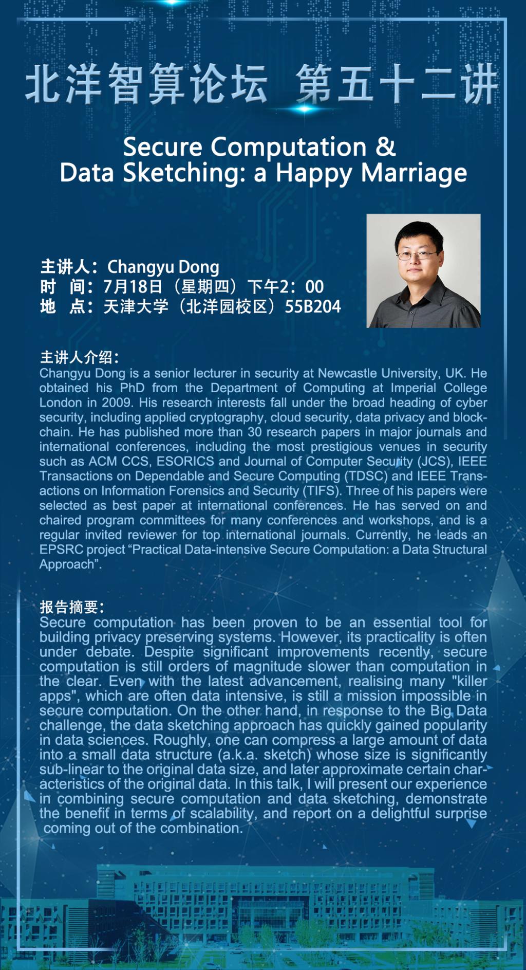 Changyu Dong is a senior lecturer in security at Newcastle University, UK. He obtained his PhD from the Department of Computing at Imperial College London in 2009. His research interests fall under the broad heading of cyber security, including applied cryptography, cloud security, data privacy and blockchain. He has published more than 30 research papers in major journals and international conferences, including the most prestigious venues in security such as ACM CCS, ESORICS and Journal of Computer Security (JCS), IEEE Transactions on Dependable and Secure Computing (TDSC) and IEEE Transactions on Information Forensics and Security (TIFS). Three of his papers were selected as best paper at international conferences. He has served on and chaired program committees for many conferences and workshops, and is a regular invited reviewer for top international journals. Currently, he leads an EPSRC project “Practical Data-intensive Secure Computation: a Data Structural Approach”.
