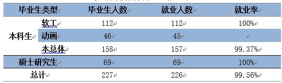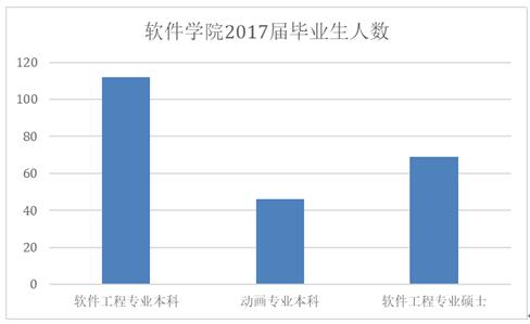 软件学院2017届毕业生共227人。其中本科生158人,占毕业生总人数69.6%(软件工程专业112人,占本科毕业生70.89%。动画专业46人,占本科生毕业生29.11%)。硕士研究生69人,占毕业生总人数30.4%。
