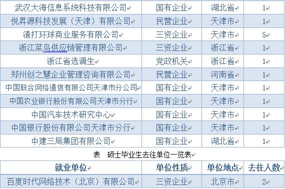 硕士研究生,签约民营企业的为18人,占硕士就业总人数的30.51%;签约国有企业的17人,占28.81%;签约三资企业的19人,占32.2%;签约科研院所、党政机关、事业单位、高等院校的共计5人,占8.47%。