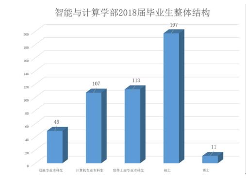 本学部2018届毕业生中,以各种形式直接就业的共有341人。其中21人自由职业(软件工程7人,动画14人)。本科生145人,占本科生总毕业人数的53.9%;硕士研究生187人,占硕士生总毕业生人数的94.9%;博士研究生9人,占博士生总毕业生人数的81.8%。
