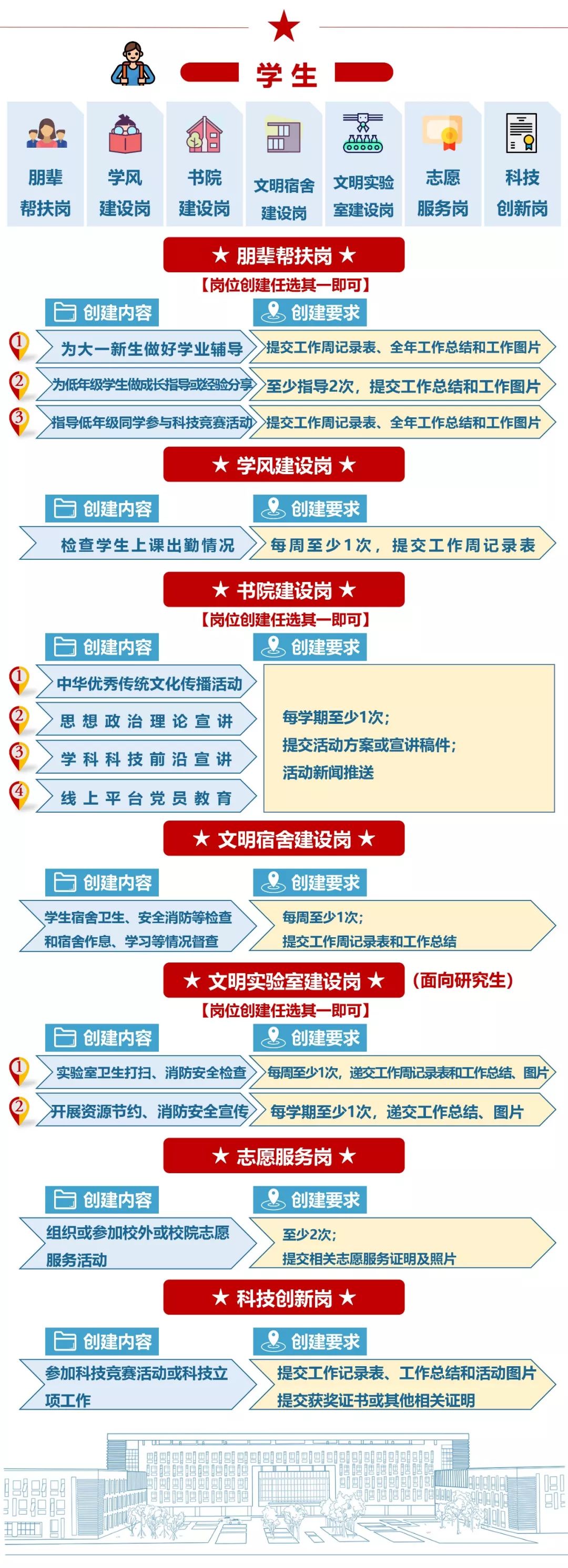 党员示范岗包含五大类教师党员示范岗和七大类学生党员示范岗,今天,通过下图告诉你党员示范岗要这样干!